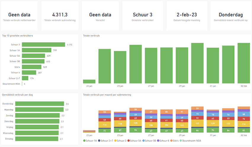 Inmiddels zijn de eerste resultaten al binnen bij Ruhenberg. Marloes en Hans kunnen deze ook zelf inzien. Na een dikke week meten is duidelijk dat schuur 3 de grootste verbruiker is.