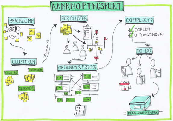 ‘Tijdens de braindump zie je ook op hoeveel verschillende fronten je bezig bent.’ vertelt Simone. ‘Soms denken mensen heel erg concreet over dat er een filmpje moet komen. En dan zitten andere mensen weer op een ander abstractieniveau na te denken over hoe wij samen die wijk in moeten. Dat lijkt een heel groot verschil, maar het is juist goed aan elkaar te koppelen. Dat is ook mooi aan dat je met zoveel verschillende collega’s zo’n braindump doet, iedereen denkt op een andere manier. We moeten nog de check doen of het zo compleet is. Het kan zijn dat er ergens gaten zitten, maar daar komen we dan gaandeweg ook wel achter. En dan kunnen we dat dan weer prima vullen. We worden nu door twee kanten gevoed. Zowel intern als door de inwoners. Daar kun je alleen maar je voordeel mee doen.’