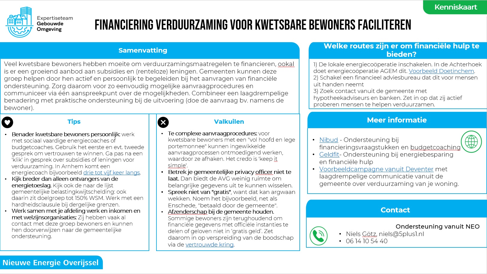 Op deze kenniskaart vind je een kort en bonding informatie over hoe je een financiering verduurzaming voor kwetsbare bewoners kan faciliteren. Ook vind je er tips en valkuilen, nuttige websites en contactpersonen die je kunt raadplegen over dit onderwerp. Kortom een handige wegwijzer!