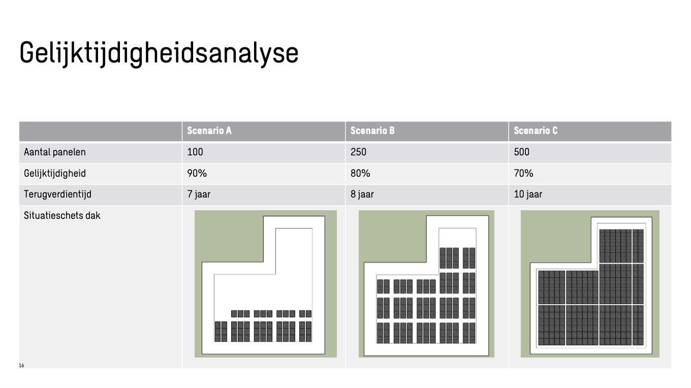 Maar hoe organiseer je dit? Een gelijktijdigheidsanalyse, waarbij gekeken wordt naar de pieken in opwek en gebruik, geeft inzicht in hoeveel van de opgewekte elektriciteit je gelijktijdig kunt verbruiken. De genoemde voorbeelden maakten duidelijk dat de keuze per situatie verschillend is, maar zeker invloed heeft op de businesscase. Zo is het voor sommige bedrijven bijvoorbeeld voldoende om maar de helft van het dak vol te leggen.