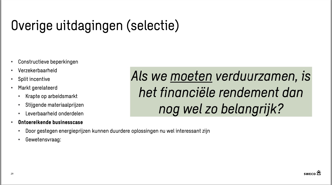 Naast netcongestie noemde Johan nog meer uitdagingen die de realisatie van zon op dak belemmeren. Denk bijvoorbeeld aan constructieve beperkingen: niet elk dak is immers sterk genoeg om panelen te dragen. Ook hebben bedrijven soms problemen met het verzekeren van hun zon-op-dak installatie. Meestal heeft dat te maken met brandveiligheid. Marktontwikkelingen, zoals de oorlog in Oekraïne, beperkte beschikbaarheid van onderdelen en stijging in materiaalprijzen, spelen ook een rol. Daarbij heeft de stijging van de elektriciteitsprijzen ook invloed op de businesscase van zon-op-dak. Door deze stijging kan het voor bedrijven nu toch interessant zijn om zonnepanelen te overwegen.