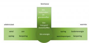– Als vervanger van aardolie en aardgas in de industrie. Ook kan biomassa ingezet worden als brandstof voor hoge temperatuur productieprocessen.