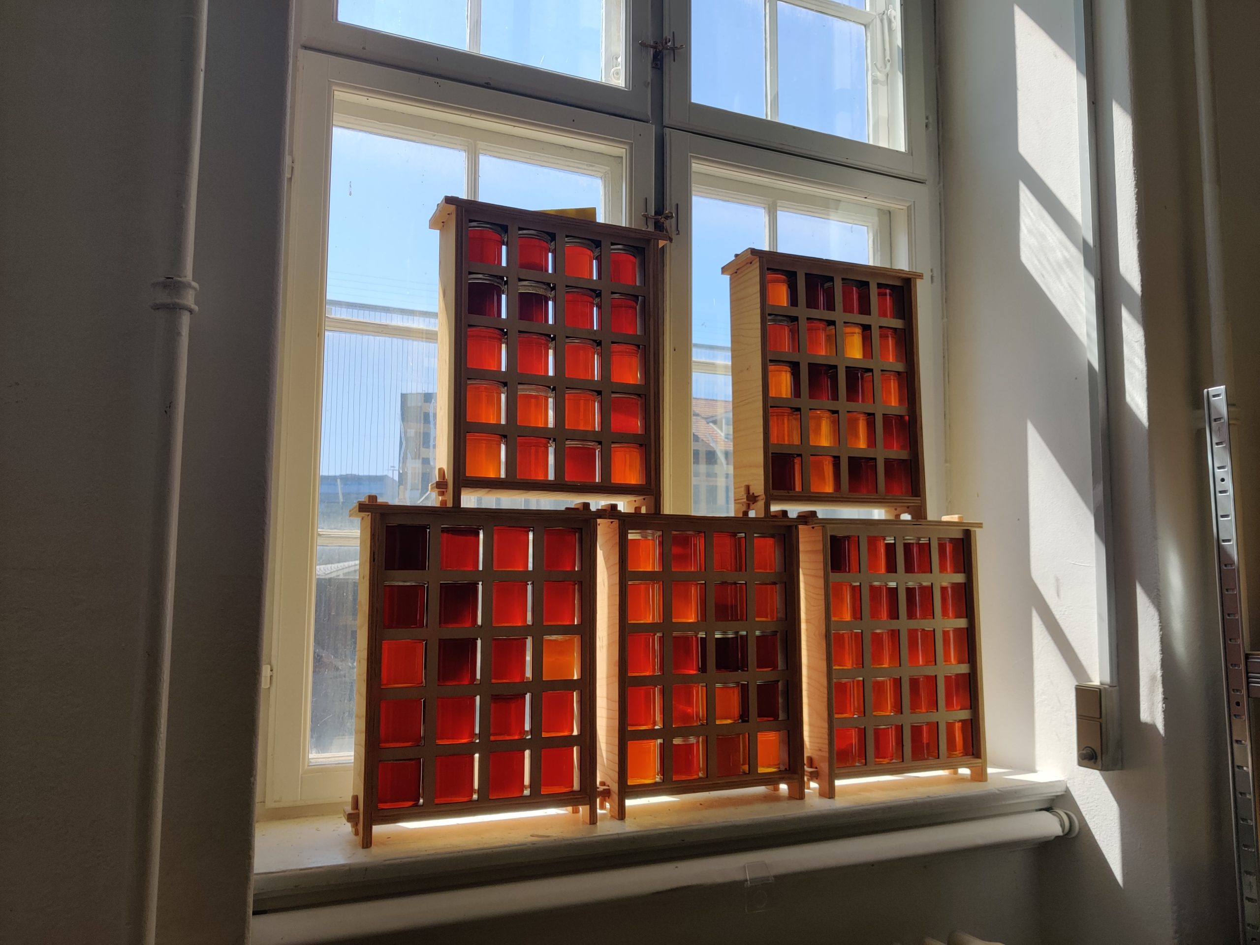 Bybi produceert honing in verschillende delen van Kopenhagen. Tijdens de rondleiding zien we veel potjes honing, vaak met kleuren wisselend van licht naar donker. Dit kleurverschil komt door de locatie waar de bijen leven en hoe nat of droog een bepaald jaar is geweest. Zo is op de foto de honing van het jaar 2022 te zien. Hier zie je weinig kleurverschil, wat betekent dat het een droog jaar was.