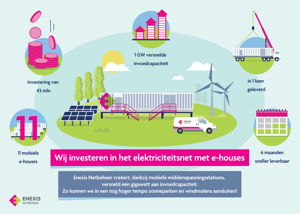 Enexis Netbeheer investeert een extra 43 miljoen euro in deze zogenaamde e-houses om de energietransitie te versnellen. Het voordeel van zo ’n mobiel station – ook wel e-house geheten – is dat het als één geheel door de fabrikant geleverd wordt. Hierdoor wordt het geheel stukken sneller opgeleverd, zonder dat het de netbeheerder veel extra mankracht kost. De netbeheerder is voortdurend op zoek naar manieren om de energietransitie te versnellen. Een pilot met vier van zulke stations (drie in het Groningse Weiwerd, één in het Brabantse Etten-Leur) is het afgelopen jaar succesvol gebleken. Op basis hiervan besluit Enexis Netbeheer nu om fors extra te investeren met de aankoop van nog elf van zulke stations.