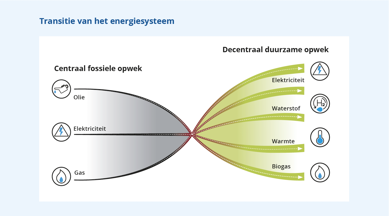 We werken aan een grote verbouwing van ons energiesysteem. We stappen in hoog tempo van aardgas, benzine en andere brandstoffen af en vervangen veel daarvan door elektriciteit. Ook aardwarmte, groen gas en andere duurzame energiebronnen worden ontwikkeld.
