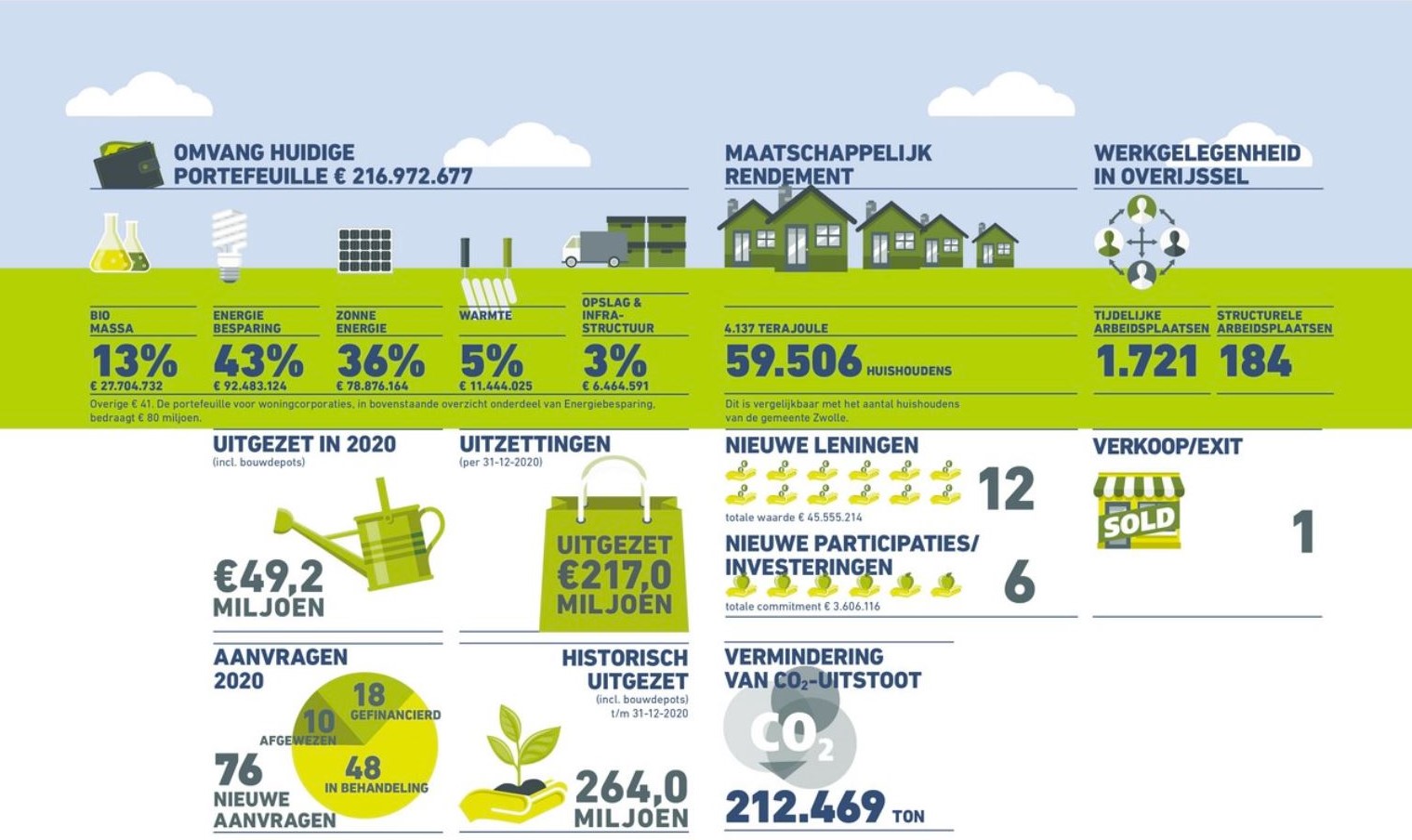 Het jaarverslag van het Energiefonds Overijssel 2020 staat online, met daarin een overzicht van de belangrijkste resultaten en impact van het fonds. Ben je als ondernemer actief in Overijssel en bezig met energiebesparing en/of opwekking van hernieuwbare energie? En heb je een energieproject waarvoor je financiering zoekt, of ben je bezig met de (door)ontwikkeling van een nieuwe innovatieve technologie? Dan kom je wellicht in aanmerking voor ondersteuning vanuit Energiefonds Overijssel.