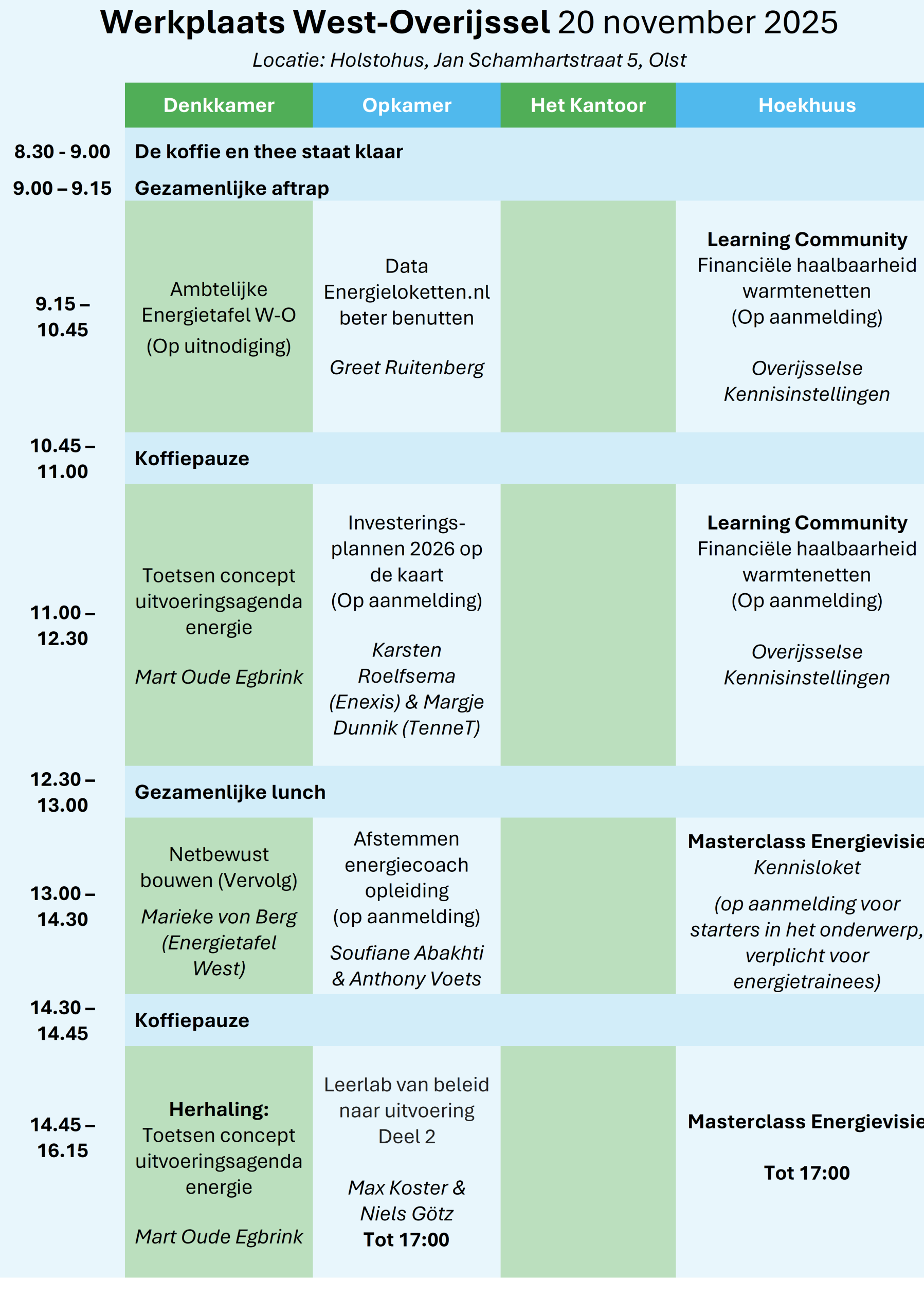 Op de Werkplaats komen kennis, ervaring en inspiratie inzake de energietransitie bij elkaar. Benut dit netwerk en ga aan de slag. Doe actief mee in een sessie. Samen kom je verder en zet jij de eerste en de volgende stap met jouw project. Wil je weten wat we gaan doen? Meld je dan aan via onderstaande link. Je ontvangt dan vrijblijvend het programma. Tot snel in de Werkplaats!