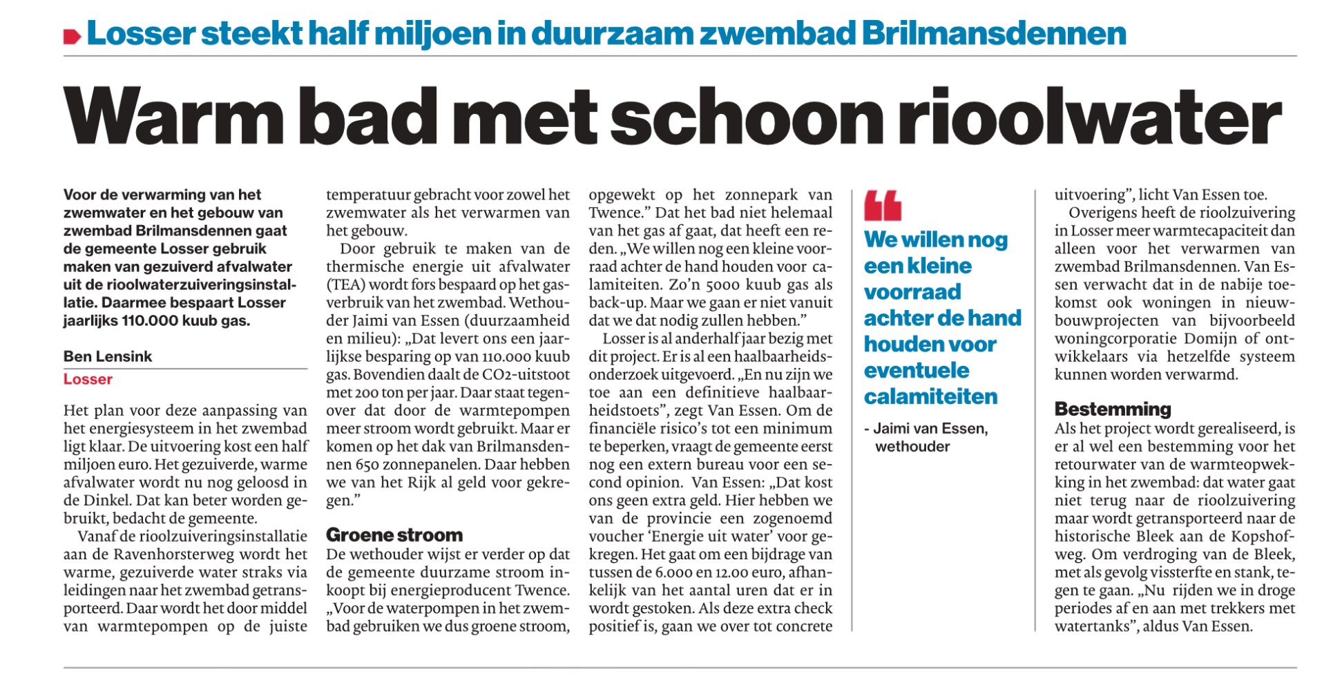 Losser heeft als eerste gemeente van het aanbod gebruik gemaakt voor ondersteuning middels de voucher. In de kern van de gemeente Losser wordt gekeken naar de mogelijkheden van thermische energie uit afvalwater. Als het zwembad Brilmansdennen omgebouwd kan worden naar een systeem met lage temperatuurverwarming, kan deze d.m.v. warmtepompen gevoed worden door het effluent van de RWZI en zo het zwembad voorzien van haar warmtebehoefte.
