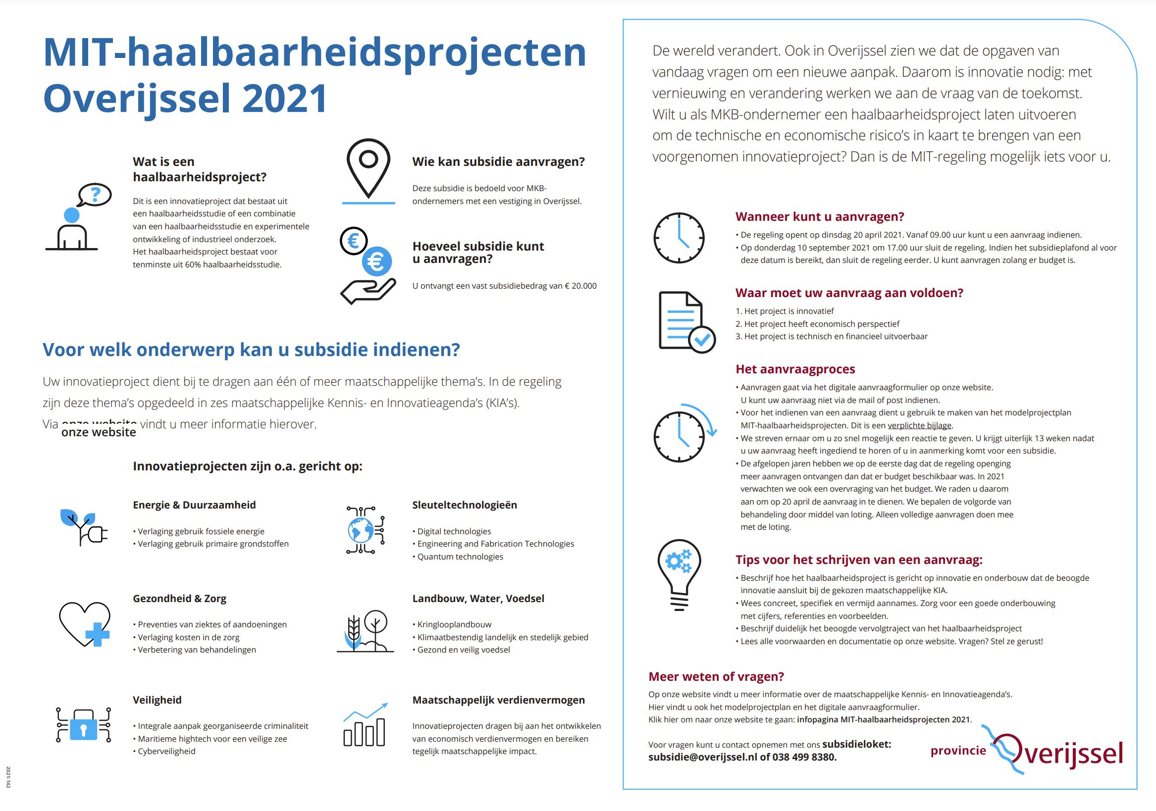 U vindt ook meer informatie op de website van provincie Overijssel. Op deze pagina vindt u tevens het digitale aanvraagformulier en de verplichte bijlage het modelprojectplan. De volledige beschreven Overijsselse subsidieregeling MIT-Haalbaarheidsprojecten 2021 vindt u in subparagraaf 6.7.2 van het Uitvoeringsbesluit subsidies. Klik hier voor het Uitvoeringsbesluit subsidies Overijssel 2017.