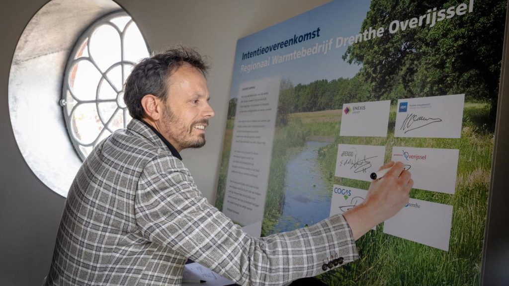 Energiegedeputeerde Tijs de Bree ondertekent een intentieovereenkomst voor een gezamenlijk warmtebedrijf in Drenthe en Overijssel
