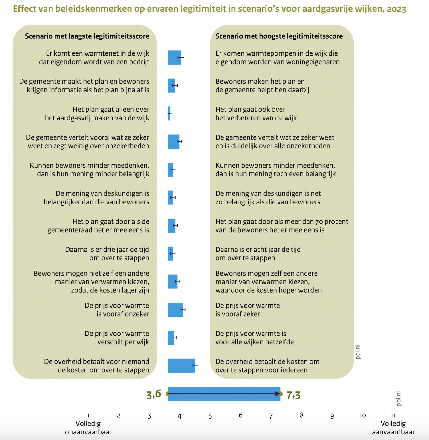 “Burgers vinden wijkplannen niet aanvaardbaar als belangrijke beleidskeuzes afwijken van wat ze legitiem vinden. Zij verwachten dat het aardgasvrijbeleid zal afwijken van wat zij legitiem vinden op het gebied van betaalbaarheid en kostenverdeling. Deze twee aspecten vinden ze doorslaggevend voor ervaren legitimiteit. De meeste burgers hebben een sterke voorkeur voor het collectief delen van kosten. Het (voorgenomen) aardgasvrijbeleid voorziet niet in een meer collectieve verdeling van de kosten.”