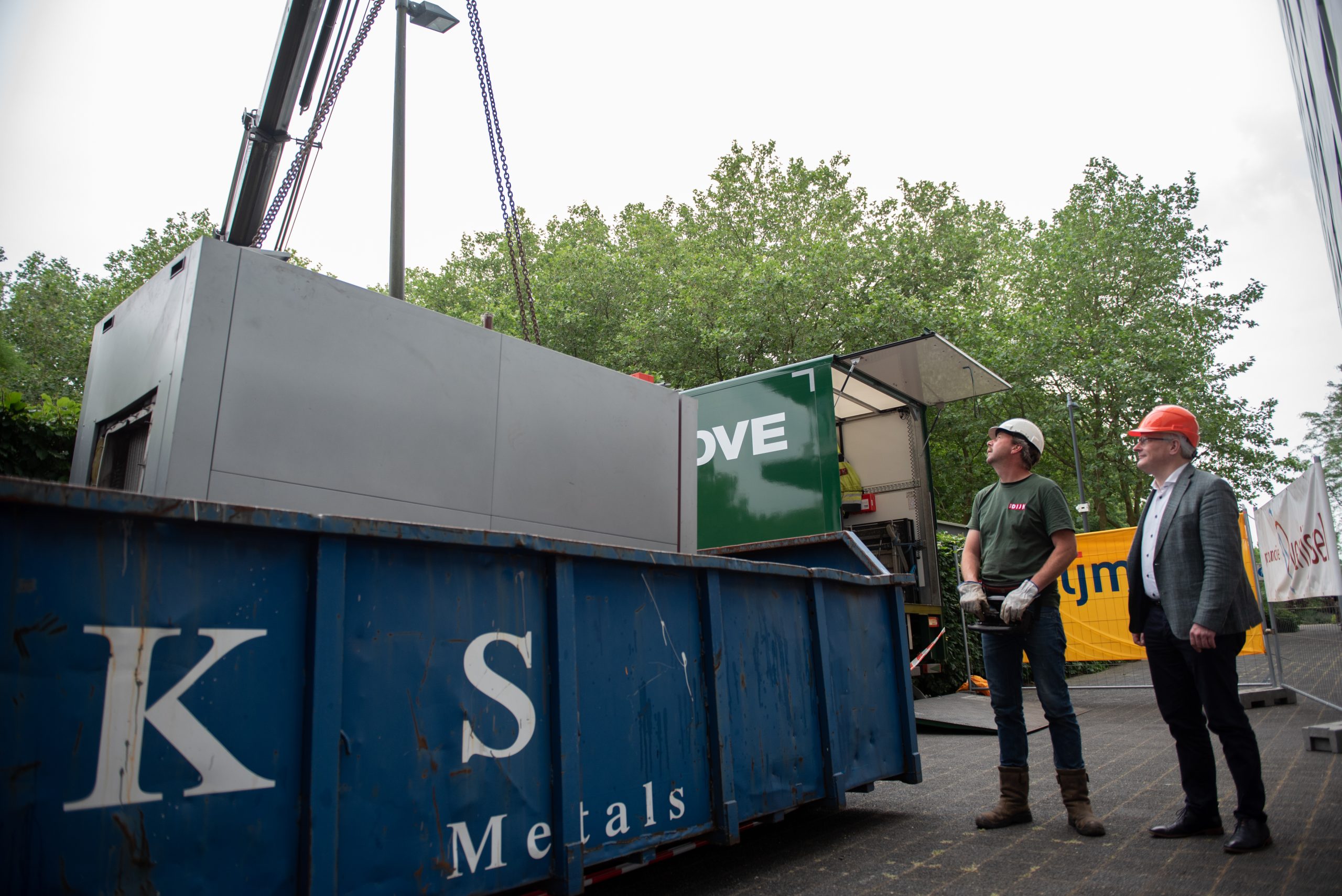De gasgestookte cv-ketel belandt in de prullenbak onder toeziend oog van gedeputeerde Gert Harm ten Bolscher.