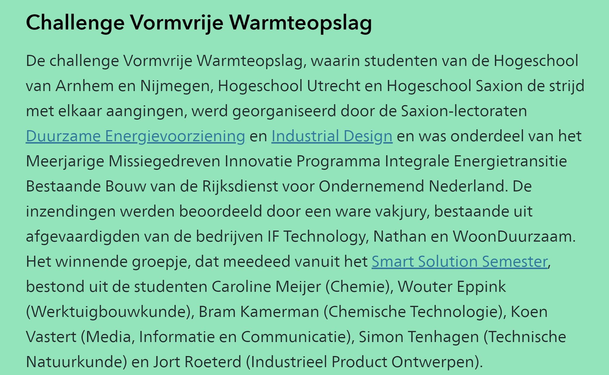Misschien krijgt de challenge binnenkort nog een vervolg, waarin gekeken wordt of de verschillende innovatieve oplossingen kunnen worden gecombineerd. “Want er waren meer groepen die met vernuftige oplossingen kwamen. Het hoeft namelijk ook niet per se op de manier zoals wij die bedacht hebben. Wij hebben dit gepresenteerd als een van de mogelijkheden en als dit anderen inspireert om ook op deze manier bijvoorbeeld een warmteopslagtank te integreren in een woonkamer, zou dat al heel mooi zijn.”