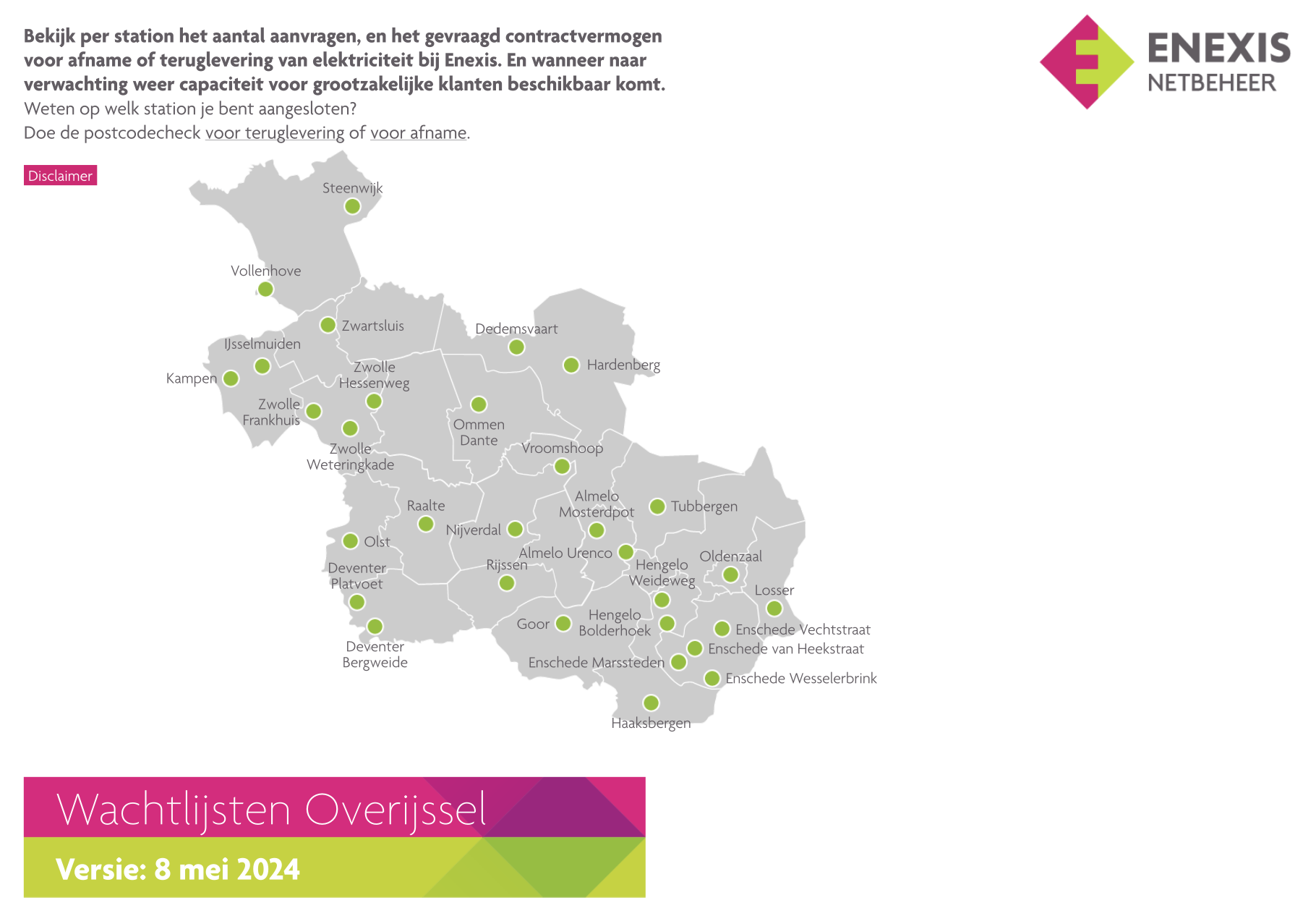 Enexis publiceerde onlangs deze kaart, waarop alle stations in Overijssel te zien zijn. Het geeft aan hoe lang de wachtlijst is voor afname en teruglevering, om hoeveel MW dit gaat, wanneer er uitbreiding gepland is en voor hoeveel MW dit is.